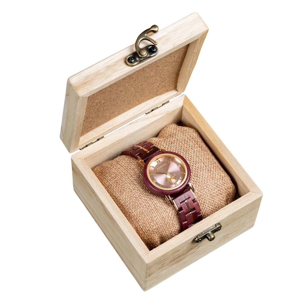 Son cadran rose et ses inserts dorés sublimés par le bois précieux d’amarante, font de cette montre un bijou chic, parfait pour les occasions spéciales. Un accessoire à l’allure distinguée, entre nature et design contemporain.